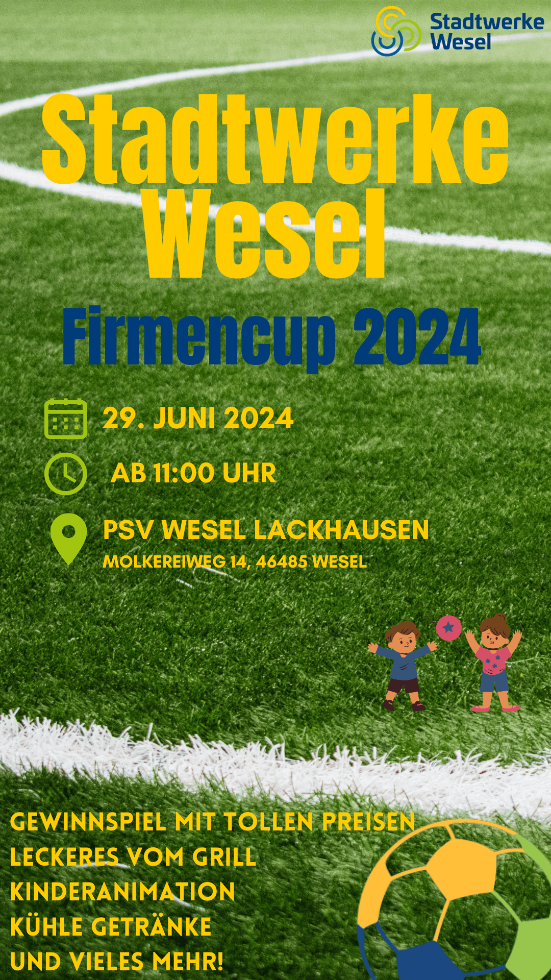 Nach einer längeren Pause veranstalten die Stadtwerke Wesel am Samstag, den 29. Juni 2024, ab 11 Uhr, den 2. Stadtwerke Wesel Firmencup auf der Platzanlage des PSV Wesel (Molkereiweg 14, 46485 Wesel).