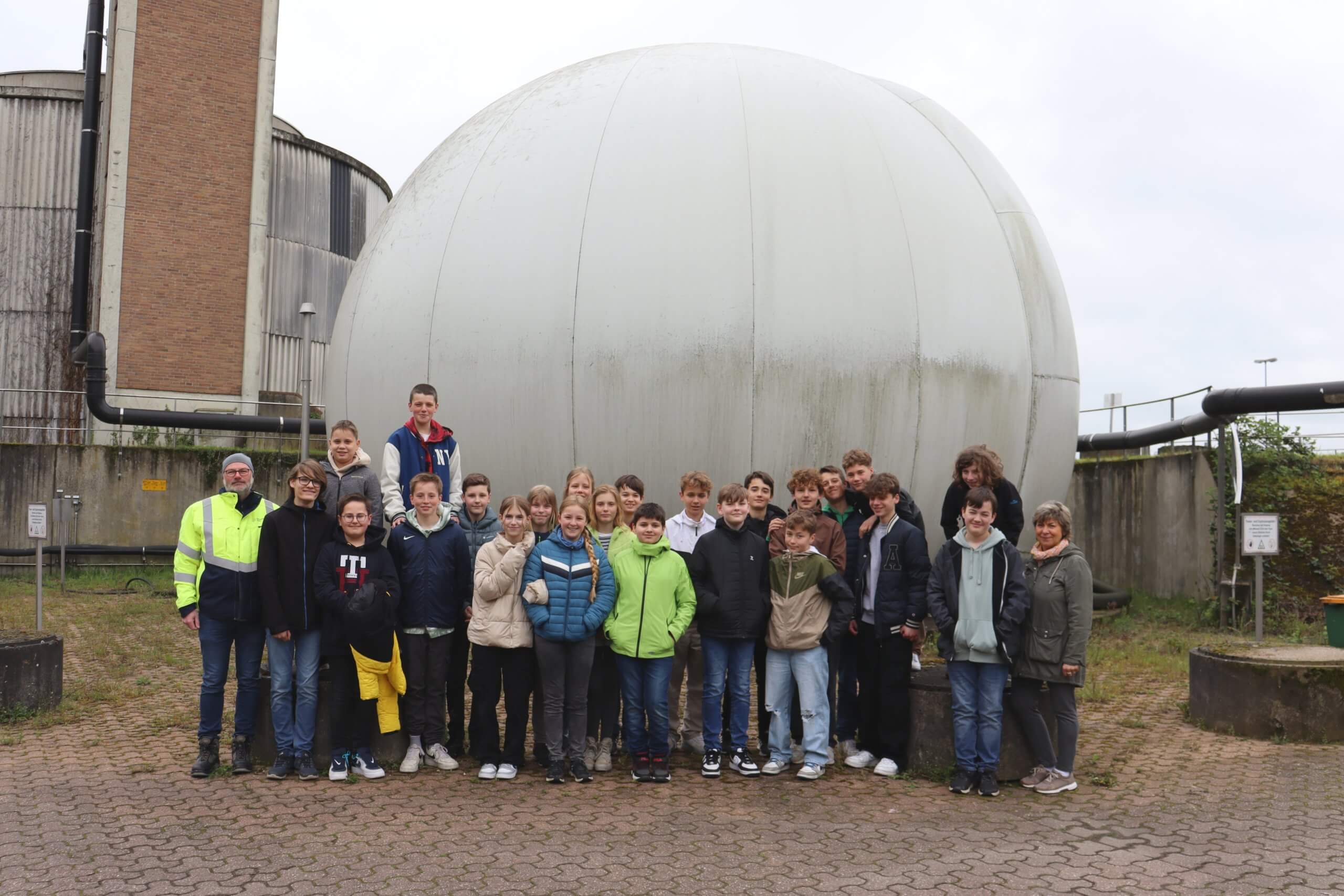 Man merkt seine Erfahrung, was interessieren könnte und dass der Blick hinter die Klärwerksmauern spannend ist. Das Klärwerk mit seinen großen Becken und den Faultürmen ein eher nüchterner, zweckbestimmter Platz, absolut nicht schön, sieht man von den extra eingesäten Blühstreifen ab, die gegen diese Kargheit anwachsen. Aber es gibt viele Menschen, die neugierig darauf sind, hinter die Kulissen zu schauen. Gerade eben war das Fachwerk Kreis Wesel aus Moers, das in der Berufsvorbereitung junger Erwachsener tätig ist, und der SKF – Sozialdienst katholischer Frauen – Wesel zu Gast, erzählt Jens Kiel. Die siebten Klassen des KDG sind sozusagen Stammgäste. Guter Unterricht lebt eben von der direkten Anschauung.
