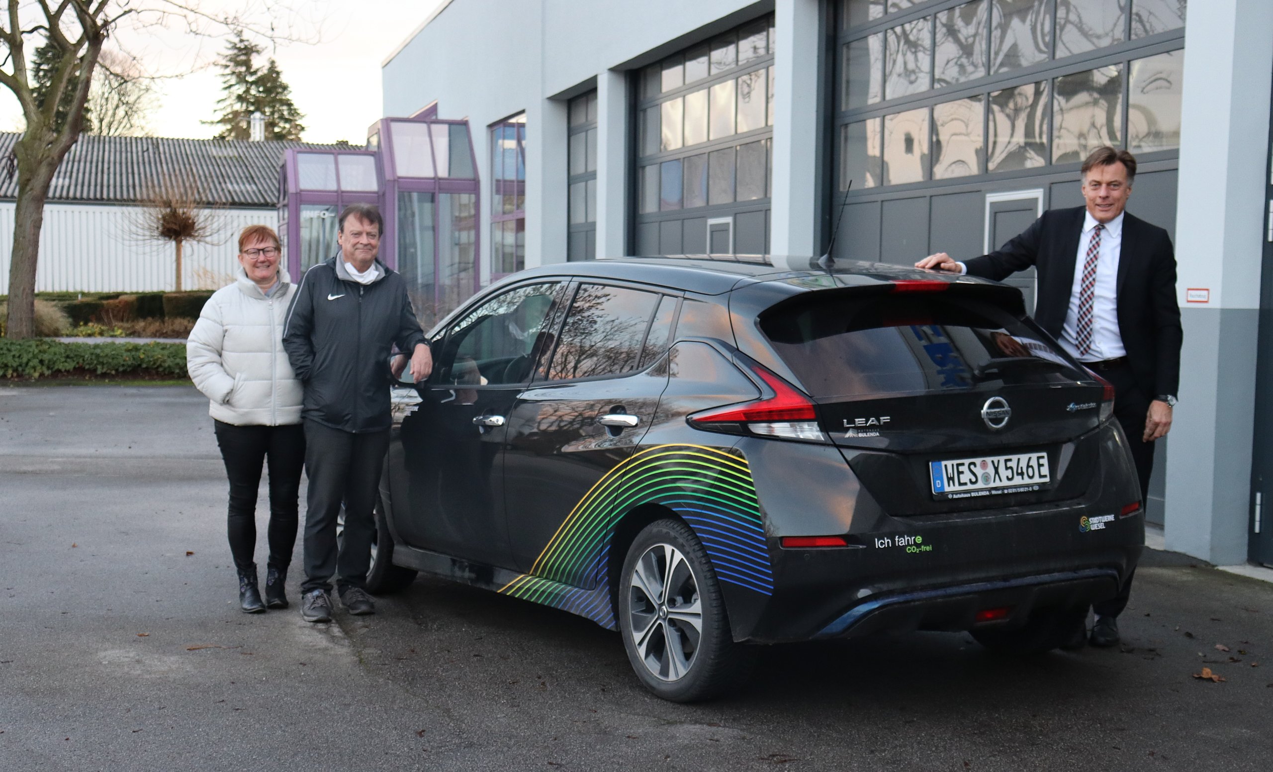 Die Stadtwerke Wesel haben ihren Kunden im August und September 2020 in Zusammenarbeit mit drei lokalen Kooperationspartnern angeboten, günstige Leasingverträge für Elektroautos abzuschließen. Die Autos haben ein einheitliches Erscheinungsbild und sind mit einem dezenten Stadtwerke Design ausgestattet, wofür die Kunden einen Marketingzuschuss von den Stadtwerken erhalten. Astrid und Michael Stein nahmen an dieser Aktion teil und präsentierten heute freudig ihren vollelektronischen Nissan Leaf, welcher über den Kooperationspartner Autohaus Bulenda bezogen wurde.