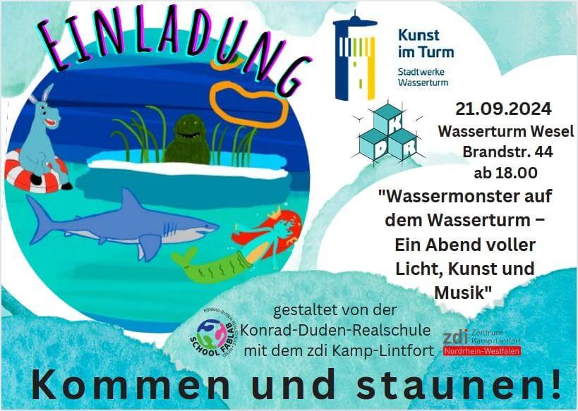 Wir freuen uns für Sie den Stadtwerke Wasserturm zur Kulturnacht am 21. September mehrstündig zu öffnen. An diesem Abend wird die Konrad Duden Realschule verschiedene Angebote im und um den Turm präsentieren, darunter das spannende Projekt „Wassermonster". Faszinierende, selbst gestaltete Animationen werden die historische Fassade des Wasserturms zum Leben erwecken. Diese Projektionen zum Thema Wasser wurden von Schüler*innen der Konrad-Duden-Realschule in Zusammenarbeit mit dem zdi Kamp-Lintfort entwickelt und werden von musikalischen Beiträgen begleitet. Kulinarische Leckerbissen und stimmungsvolle Musik sorgen für ein perfektes Ambiente während der Kulturnacht am Stadtwerke Wasserturm.