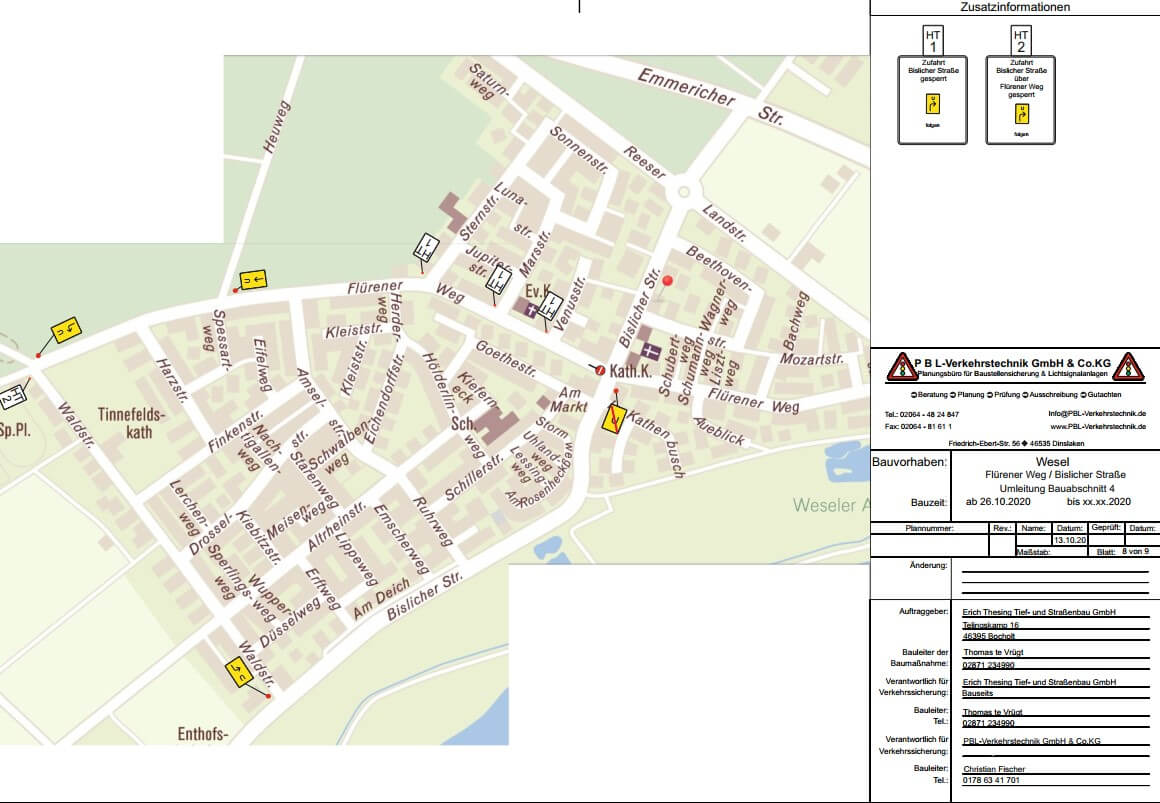 Im Erstem Abschnitt kann von der Bislicher Straße in den Flürener Weg in Richtung des Waldstadions abgebogen werden. Der Baustellenbereich wird zur Einbahnstraße, so dass die Ausfahrt über die gekennzeichnete Umleitung erfolgen wird. Die Zufahrt in den Flürener Weg in Richtung der Tankstelle / Reeser Landstraße wird nicht möglich sein. Die Anfahrt ist über die Reeser Landstraße bzw. Bislicher Straße, jeweils bis zur Baustelle möglich. Die Tankstelle ist erreichbar. Der Teil des Flürener Wegs wird zur Sackgasse. Arbeiten in diesem Abschnitt sind vom 26. Oktober bis 8. November 2020 geplant.