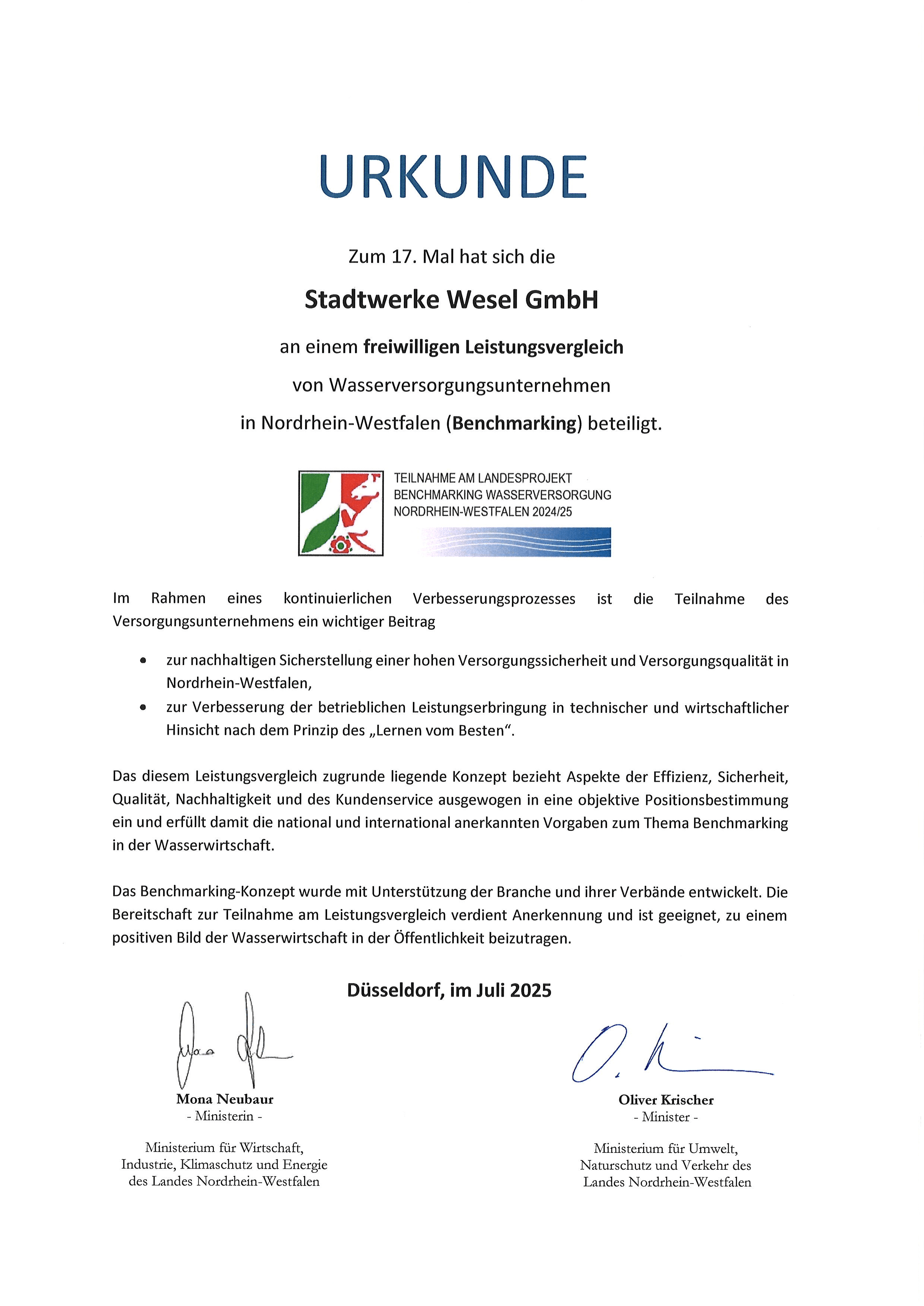 Bereits zum siebzehnten Mal haben wir an einem freiwilligen Leistungsvergleich von Wasserversorgungsunternehmen in Nordrhein-Westfalen teilgenommen. Die Teilnahme wurde im Juli 2025 von den Projektträgern der Landesregierung beurkundet.